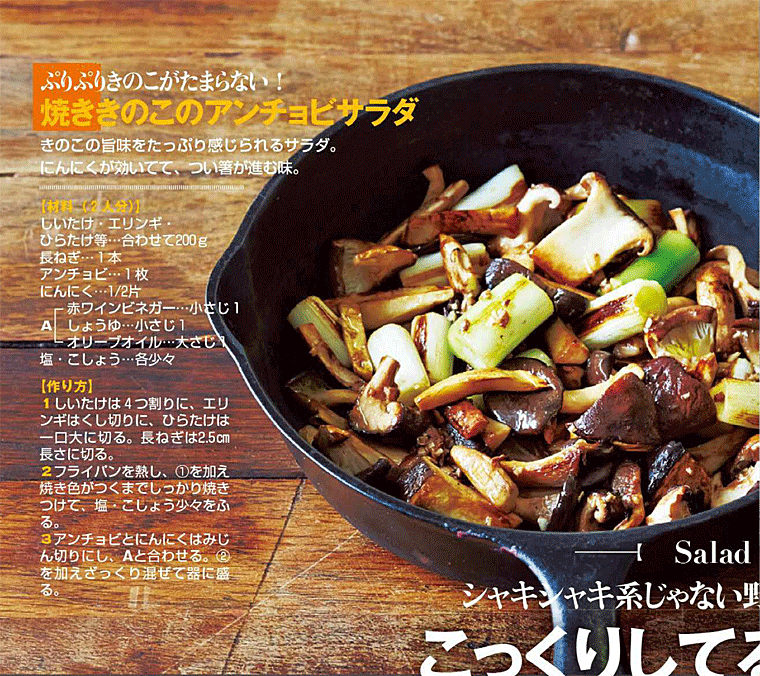 | 2015年10月5日 andGIRL 2015年10月号より シャキシャキ系じゃない野菜でもサラダ、できます こっくりしている秋の味覚で、新感覚サラダ ぷりぷりきのこがたまらない 焼ききのこのアンチョビサラダ |