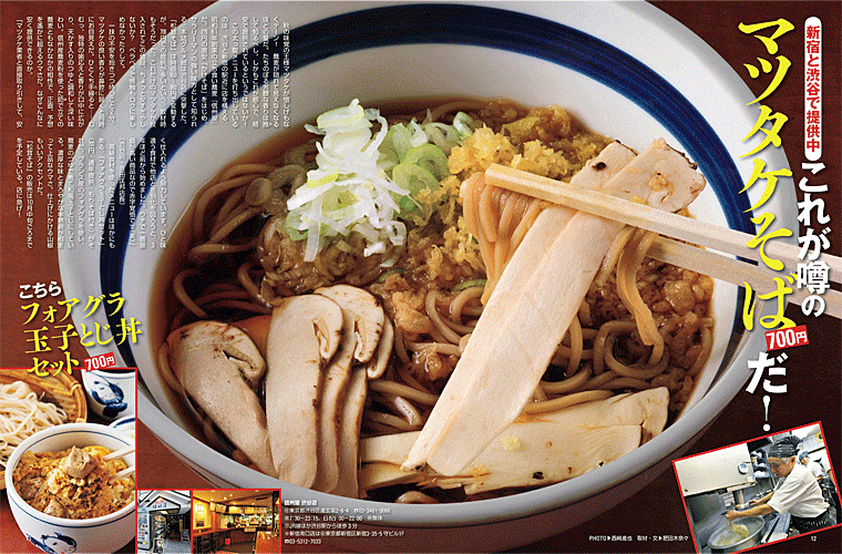 | 2015年10月19日 FRIDAY 2015年10月23日号より 「新宿と渋谷で提供中」これが噂のマツタケそばだ! 信州屋 渋谷店、新宿南口店 |