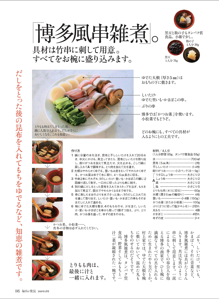 | 2016年3月23日 干しシイタケを使った「博多風串雑煮」。雑誌:毎日が発見 2016年1月号より |